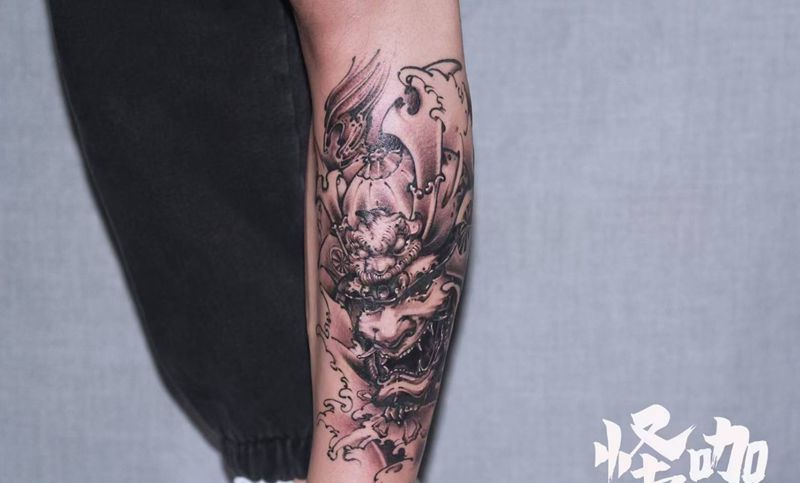 新传统鬼武士纹身图片_腿部新传统纹身图案