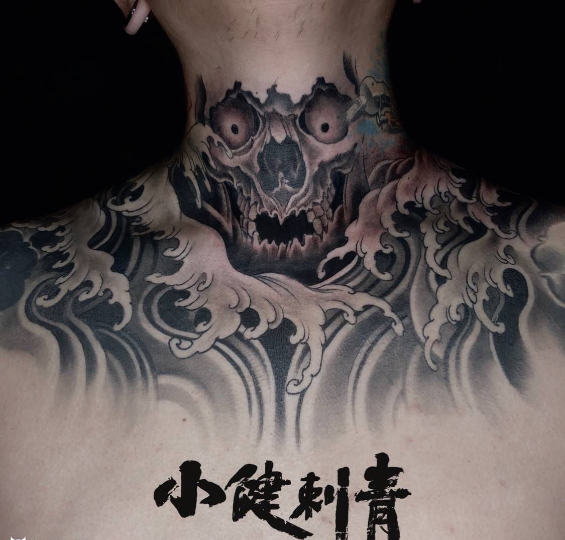 当前位置: 首页 >天津市纹身店-天津小健刺青纹身图案>水浪纹身图片_胸部颈部新传统骷髅水花纹身图案