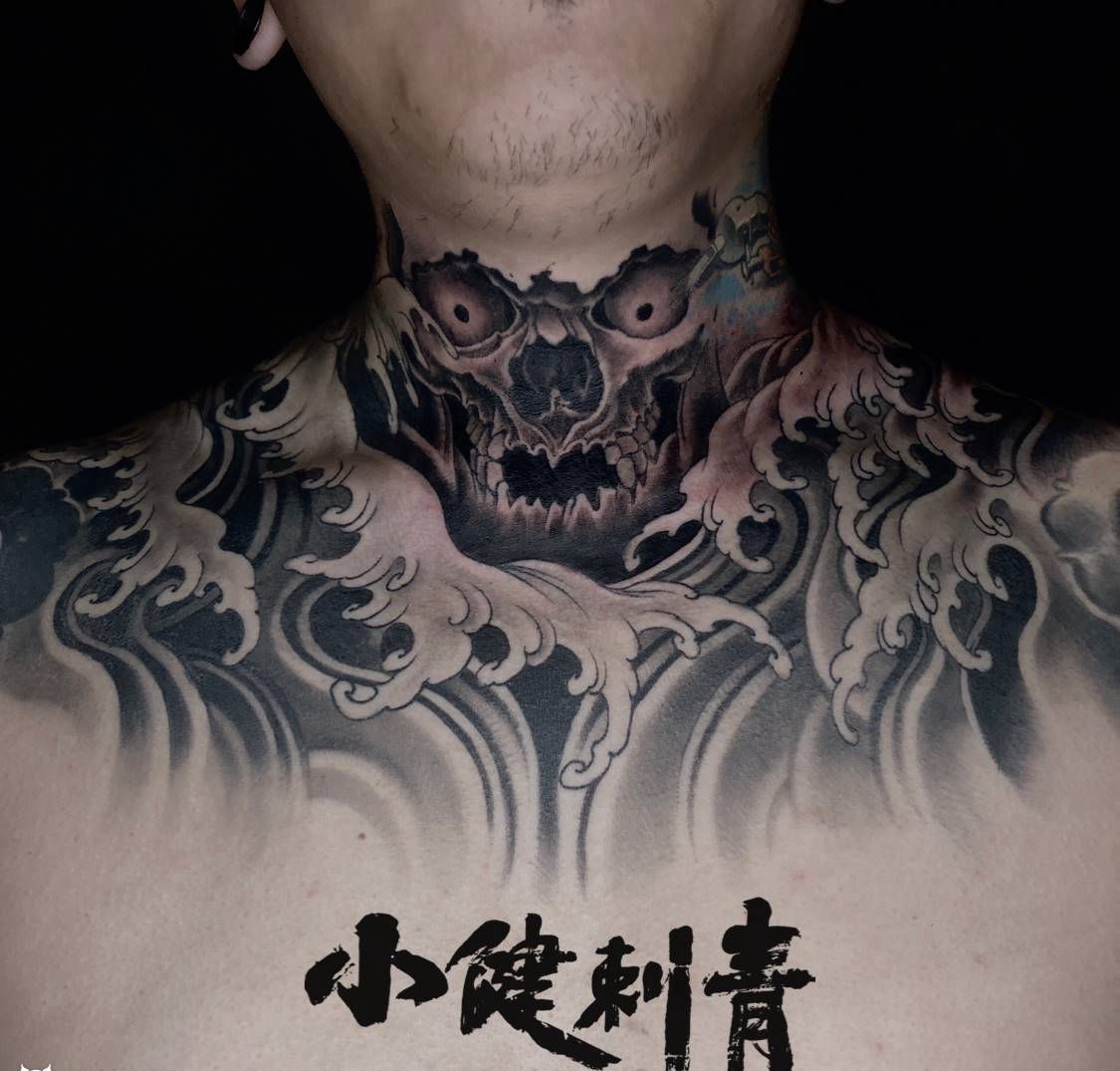 当前位置: 首页 >天津市纹身店-天津小健刺青纹身图案>水浪纹身图片_胸部颈部新传统骷髅水花纹身图案