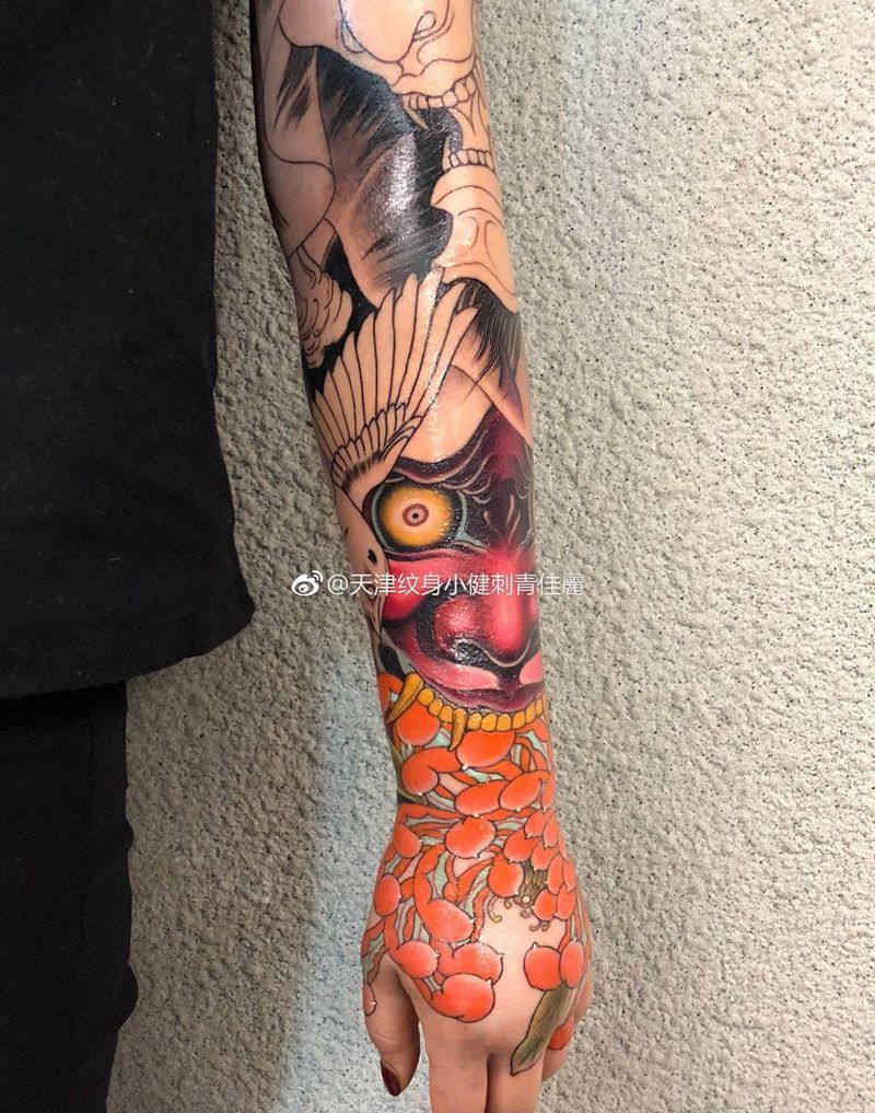 当前位置: 首页 >天津市纹身店-天津小健刺青纹身图案>花臂般若菊花与鸟纹身图片_成品手稿手臂传统宗教人物原创菊花般若纹身图案