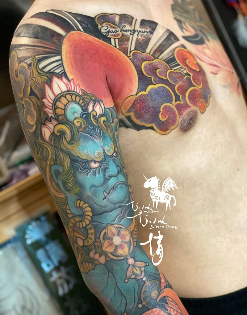 祥云不动明王纹身图片_肩部手臂新传统刺青师倩纹身图案
