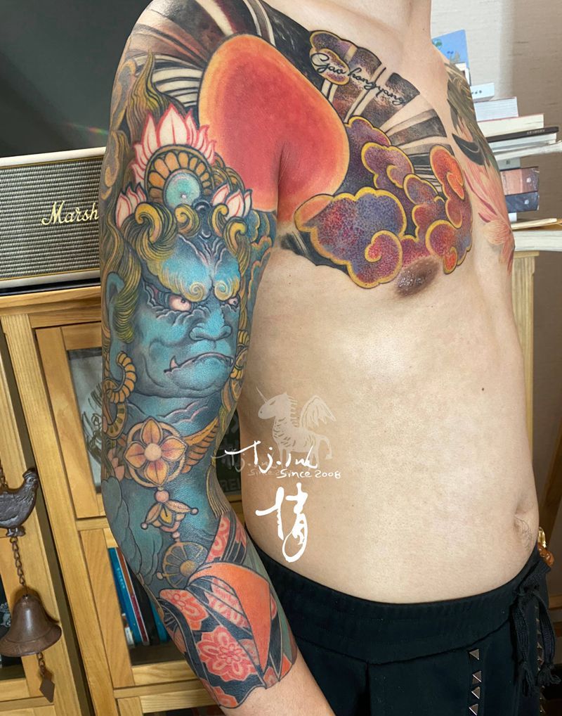 祥云不动明王纹身图片_肩部手臂新传统刺青师倩纹身图案