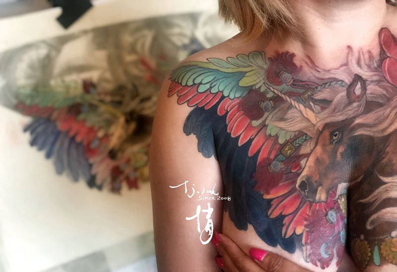 独角天马纹身图片_胸部肩部新传统刺青师倩东方神秘纹身图案