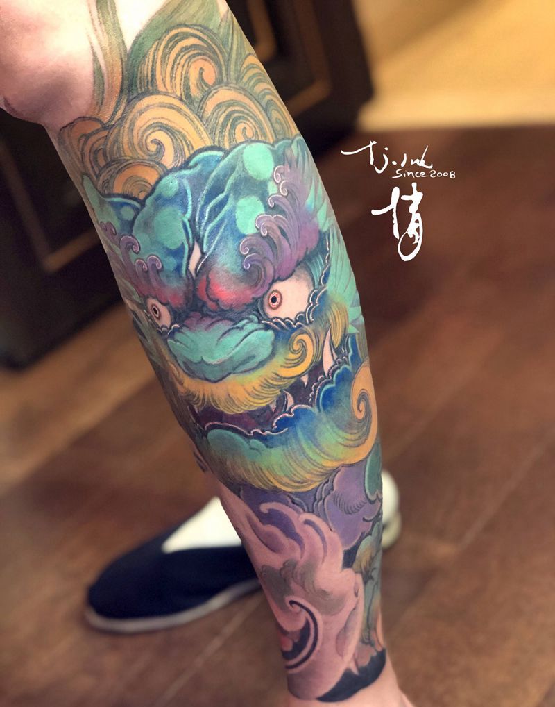 当前位置: 首页 >天津市纹身店-天惊文道刺青艺术馆纹身图案>狮子 上善若水纹身图片_腿部新传统刺青师倩东方神秘纹身图案