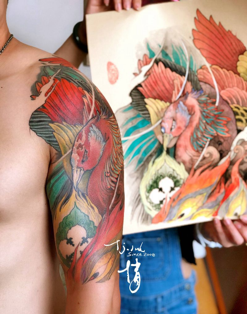 当前位置: 首页 >天津市纹身店-天惊文道刺青艺术馆纹身图案>重明鸟纹身图片_肩部手臂新传统刺青师倩东方神秘纹身图案