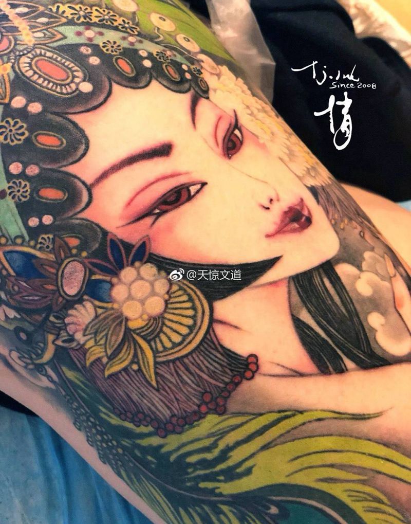 当前位置: 首页 >天津市纹身店-天惊文道刺青艺术馆纹身图案>人间尤物是青衣纹身图片_成品腿部传统国画人物原创青衣花旦纹身图案