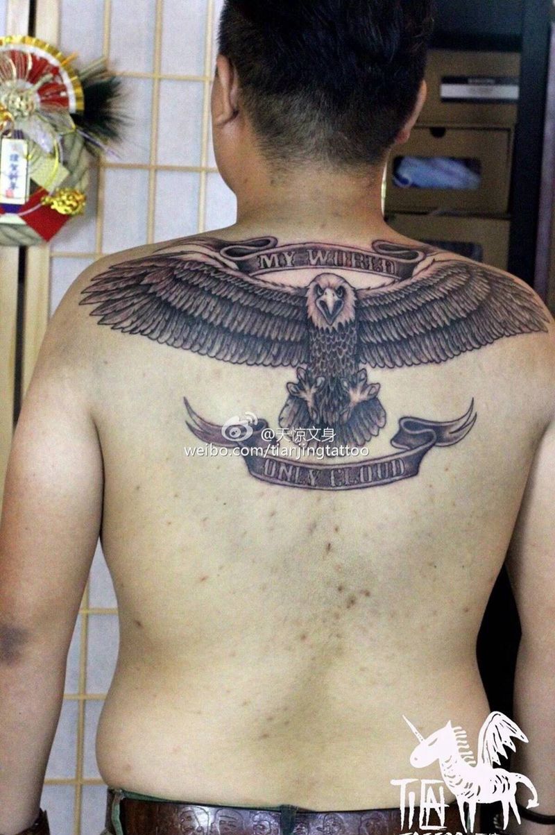 当前位置: 首页 >天津市纹身店-天惊文道刺青艺术馆纹身图案>白头鹰飞纹身图片_成品背部写实欧美动物原创纹身图案