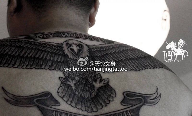 当前位置: 首页 >天津市纹身店-天惊文道刺青艺术馆纹身图案>白头鹰飞纹身图片_成品背部写实欧美动物原创纹身图案
