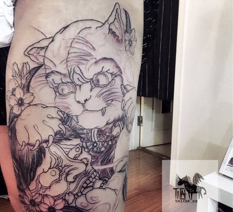 当前位置: 首页 >天津市纹身店-天惊文道刺青艺术馆纹身图案>招财猫纹身图片_成品原创鬼神动物传统国画腿部纹身图案
