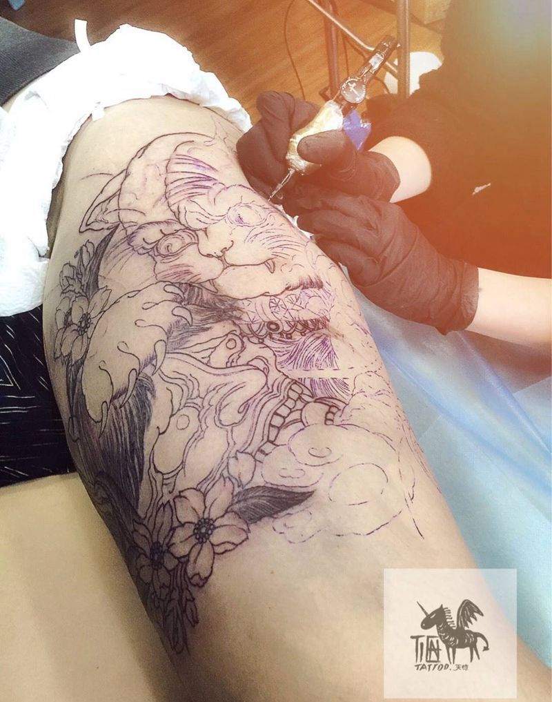当前位置: 首页 >天津市纹身店-天惊文道刺青艺术馆纹身图案>招财猫纹身图片_成品原创鬼神动物传统国画腿部纹身图案