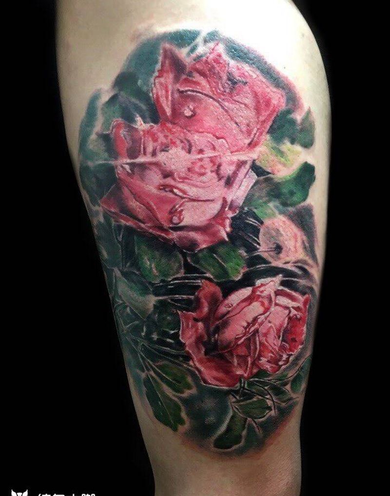 玫瑰纹身图片_成品腿部写实欧美植物纹身图案