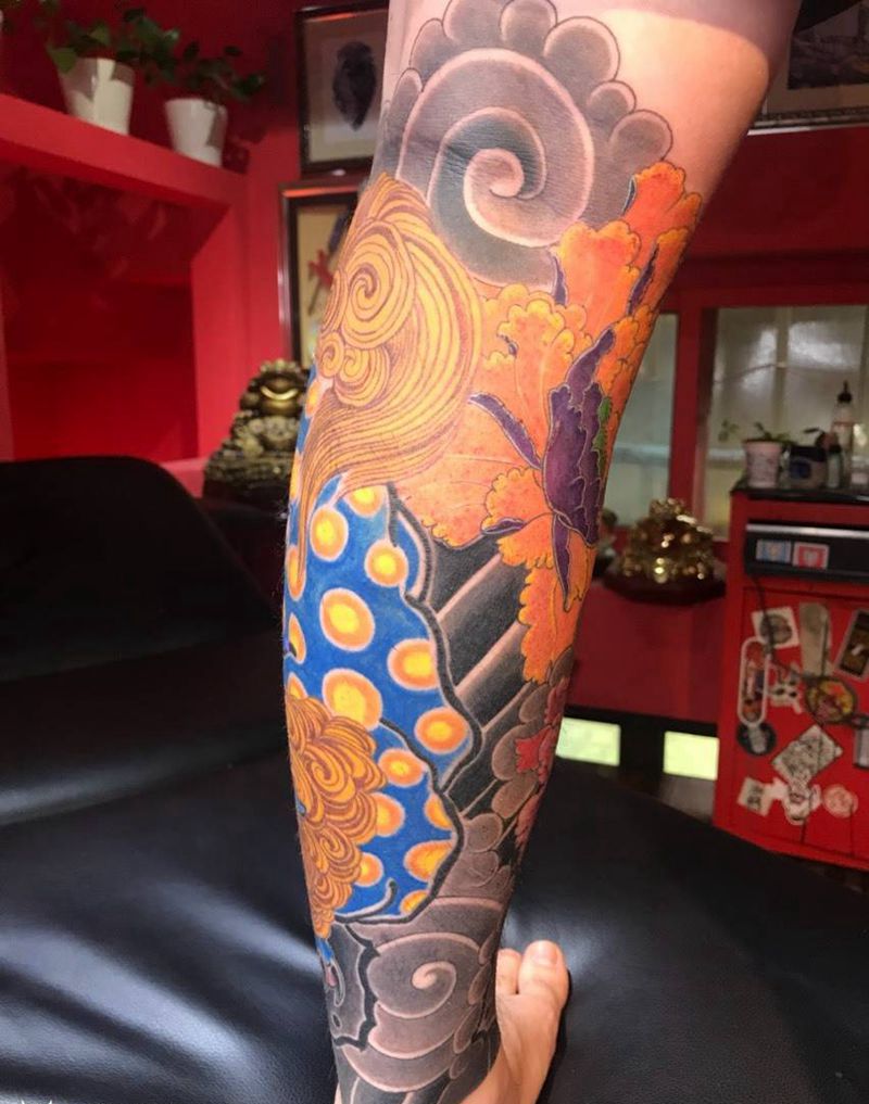 当前位置: 首页 >天津市纹身店-天津市针锋纹身工作室纹身图案>彩色裹小腿完成纹身图片_