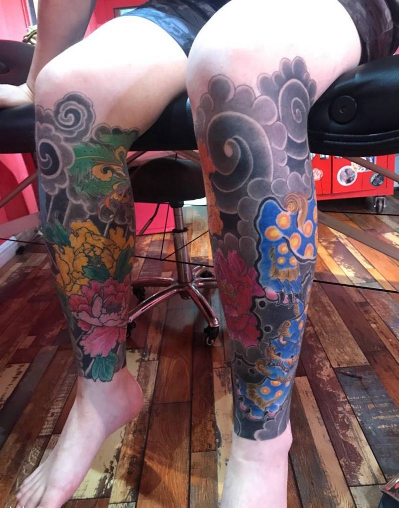 当前位置: 首页 >天津市纹身店-天津市针锋纹身工作室纹身图案>彩色裹小腿完成纹身图片_