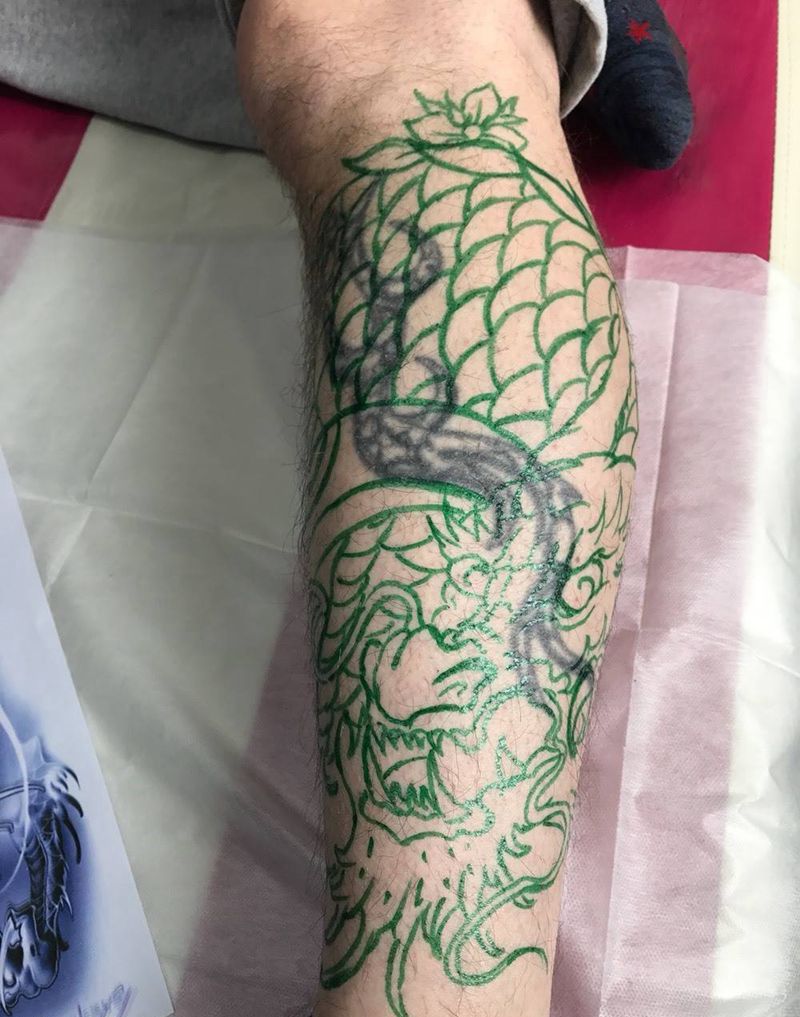 • T网红王老大花腿龙纹身图片_腿部新传统纹身图案