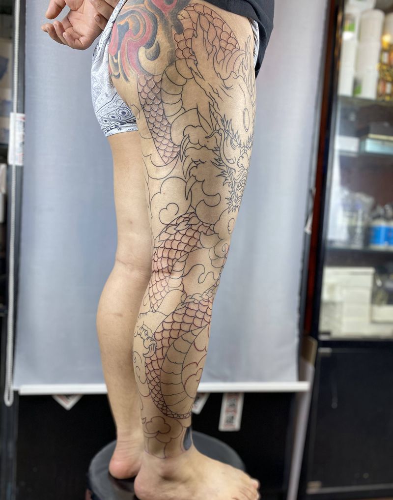 • T网红王老大花腿龙纹身图片_腿部新传统纹身图案