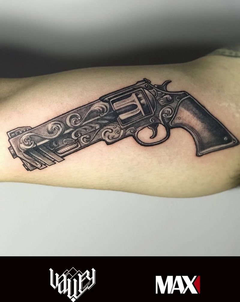 当前位置: 首页 >天津市纹身店-天津山谷刺青纹身图案>写实 枪纹身图片_成品手臂欧美写实图腾静物纹身图案