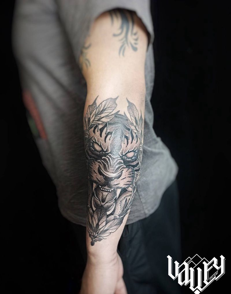 当前位置: 首页 >天津市纹身店-天津山谷刺青纹身图案>老虎纹身图片_手臂胸部新传统水彩暗黑老虎小臂纹身图案