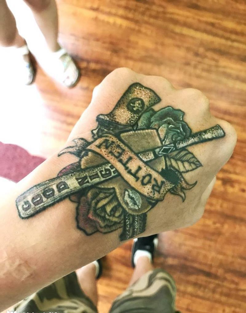 • 手背潮流时尚的玫瑰花眼睛纹身图案