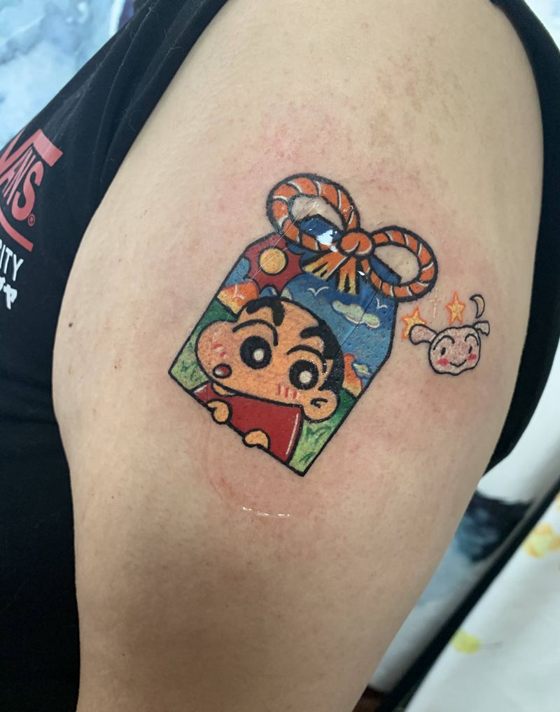 当前位置: 首页 >天津市纹身店-金刺青纹身图案>蜡笔小新福袋纹身图片_手臂欧美写实新传统纹身图案