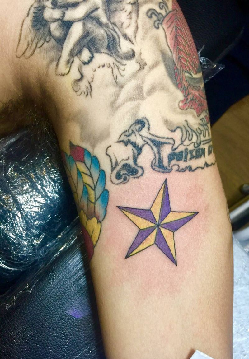 当前位置: 首页 >天津市纹身店-金刺青纹身图案>湖人配色五角星纹身图片_