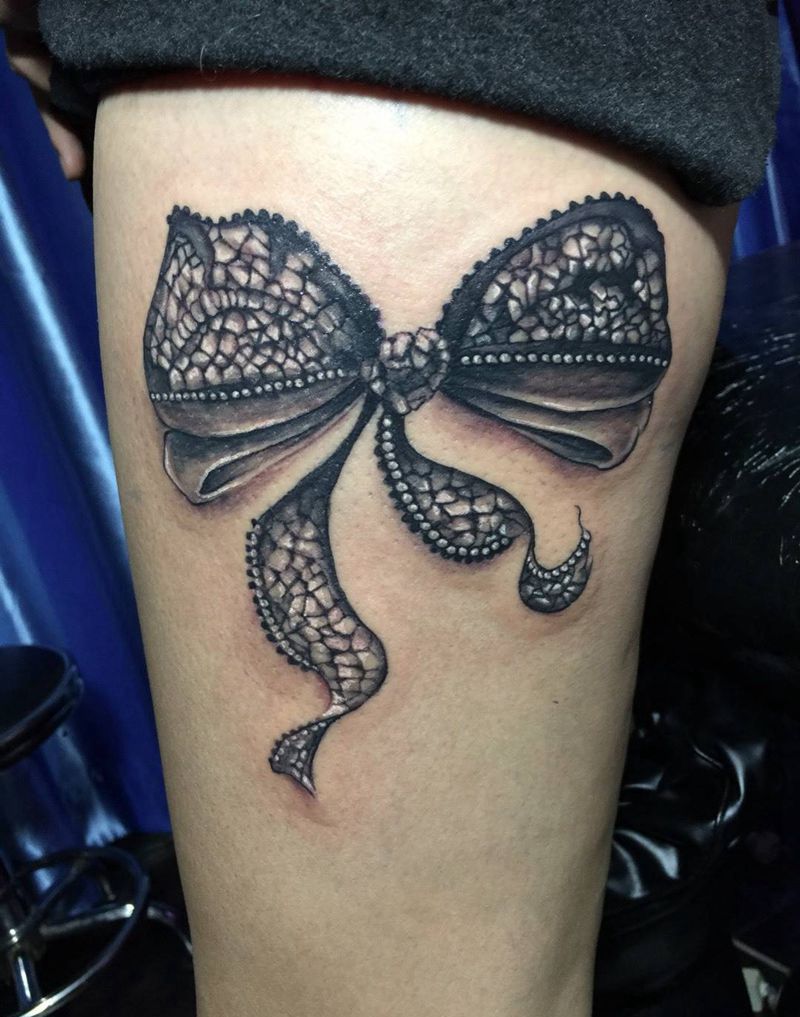 蕾丝蝴蝶结纹身图片_成品腿部欧美写实几何纹身图案