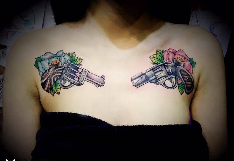 school手枪纹身图片_成品胸部欧美清新贴纸纹身图案
