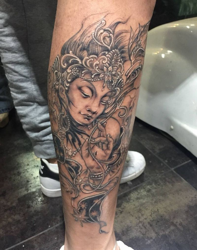 度母纹身图片_成品腿部传统人物宗教纹身图案