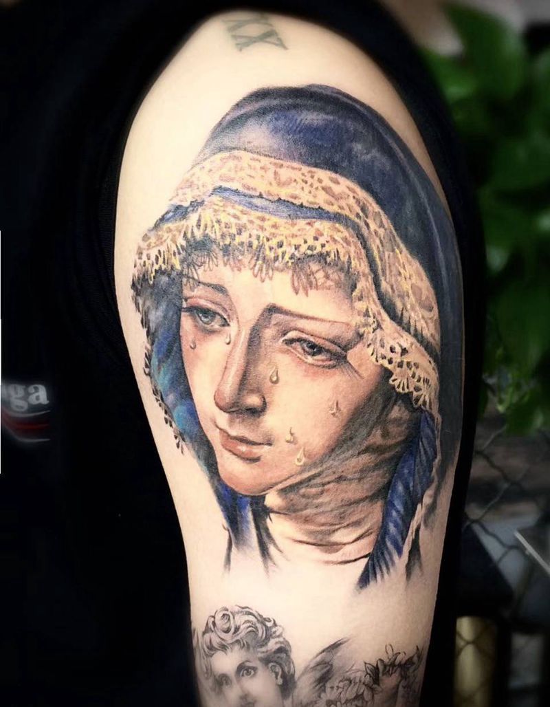 当前位置: 首页 >天津市纹身店-金刺青纹身图案>欧美写实彩色圣母纹身图片_手臂欧美写实纹身图案