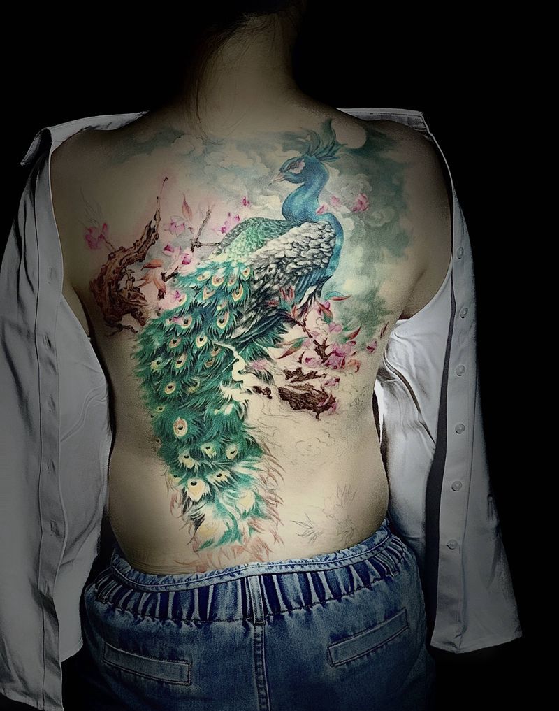孔雀满背纹身图片_背部新传统欧美写实纹身图案
