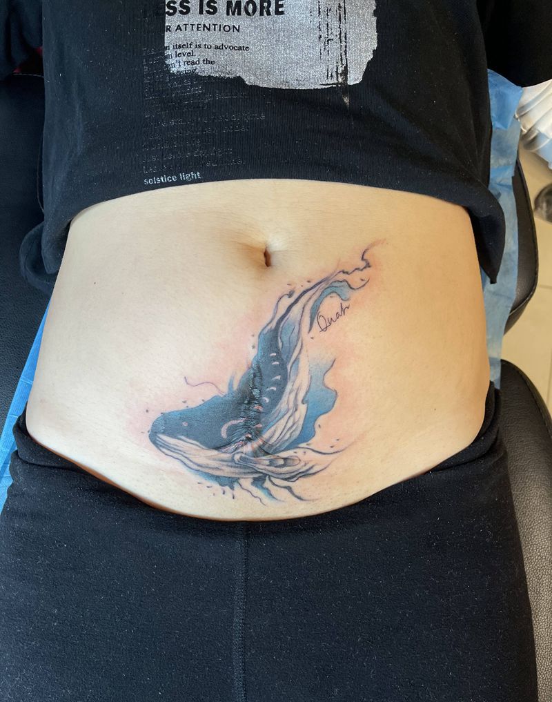 遮盖刨妇产纹身图片_腹部水彩纹身图案