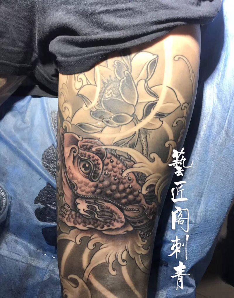 达摩与金蟾纹身图片_腿部新传统纹身图案