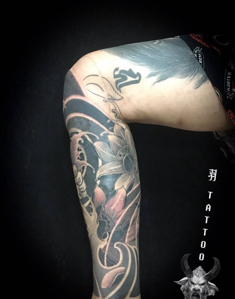 当前位置: 首页 >天津市纹身店-兿匠阁刺青纹身图案>包小腿唐狮荷花未完纹身图片_