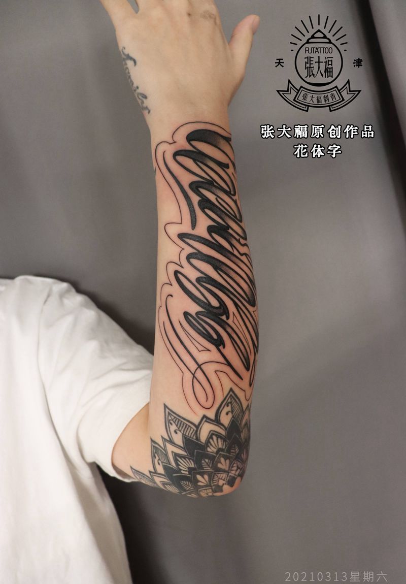 当前位置: 首页 >天津市纹身店-福刺青纹身图案>原创 花体字纹身图片_手臂花体字花体字黑灰原创纹身图案