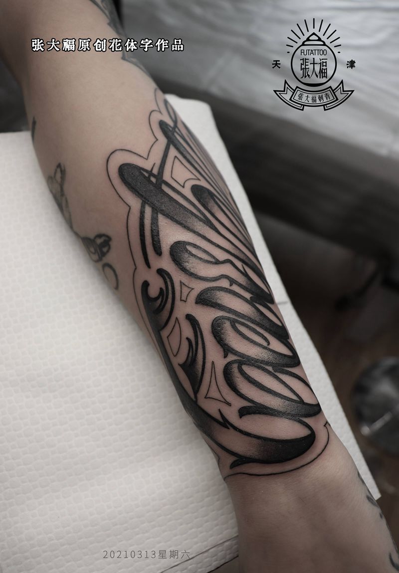 当前位置: 首页 >天津市纹身店-福刺青纹身图案>原创 花体字纹身图片_手臂花体字花体字黑灰原创纹身图案