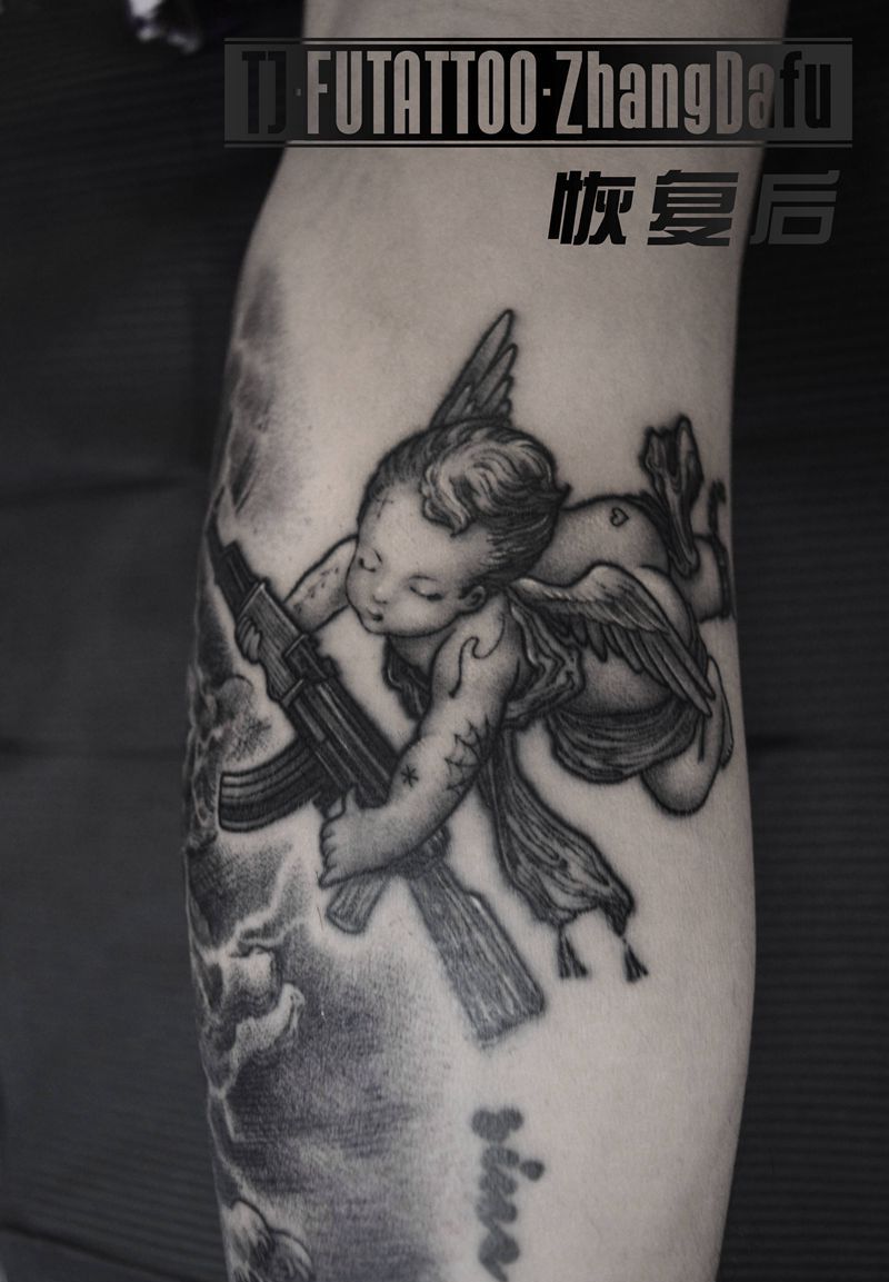 (临摹)天使 恢复后纹身图片_腿部New SchoolBlackwork点线黑灰纹身图案