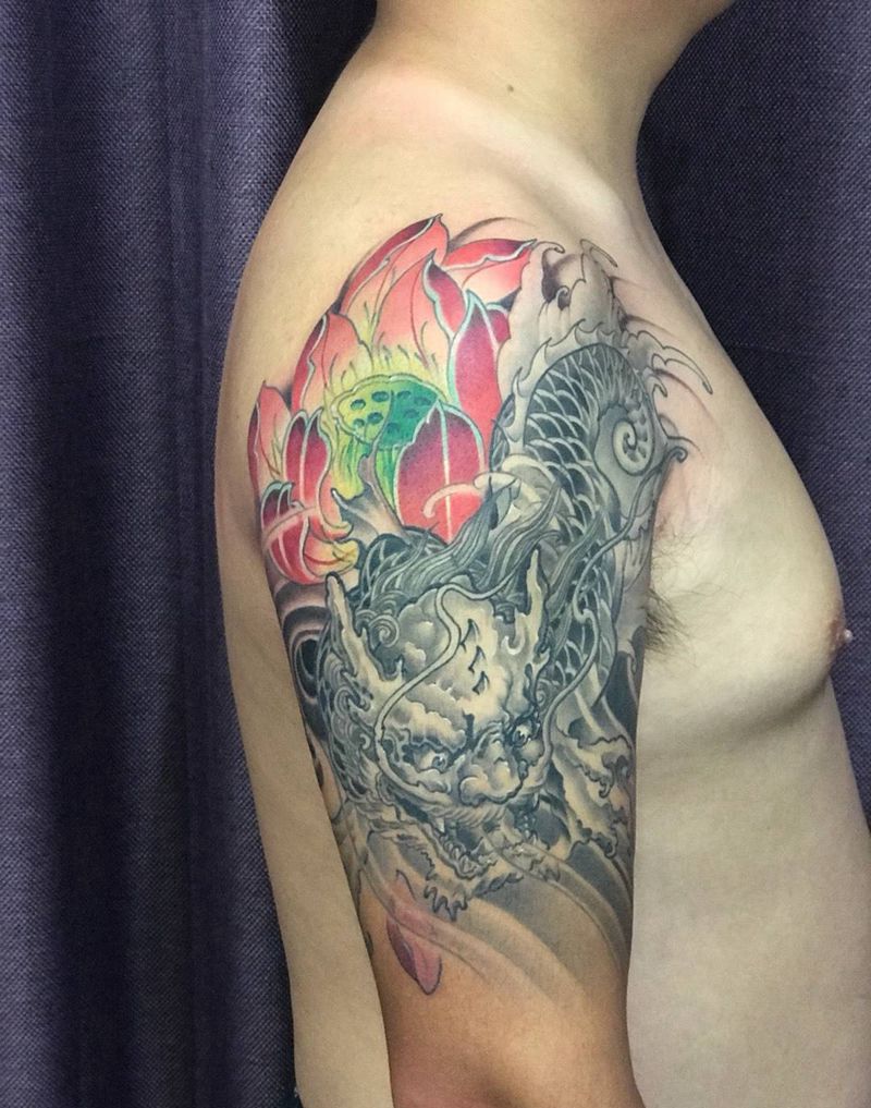 • T网红王老大花腿龙纹身图片_腿部新传统纹身图案