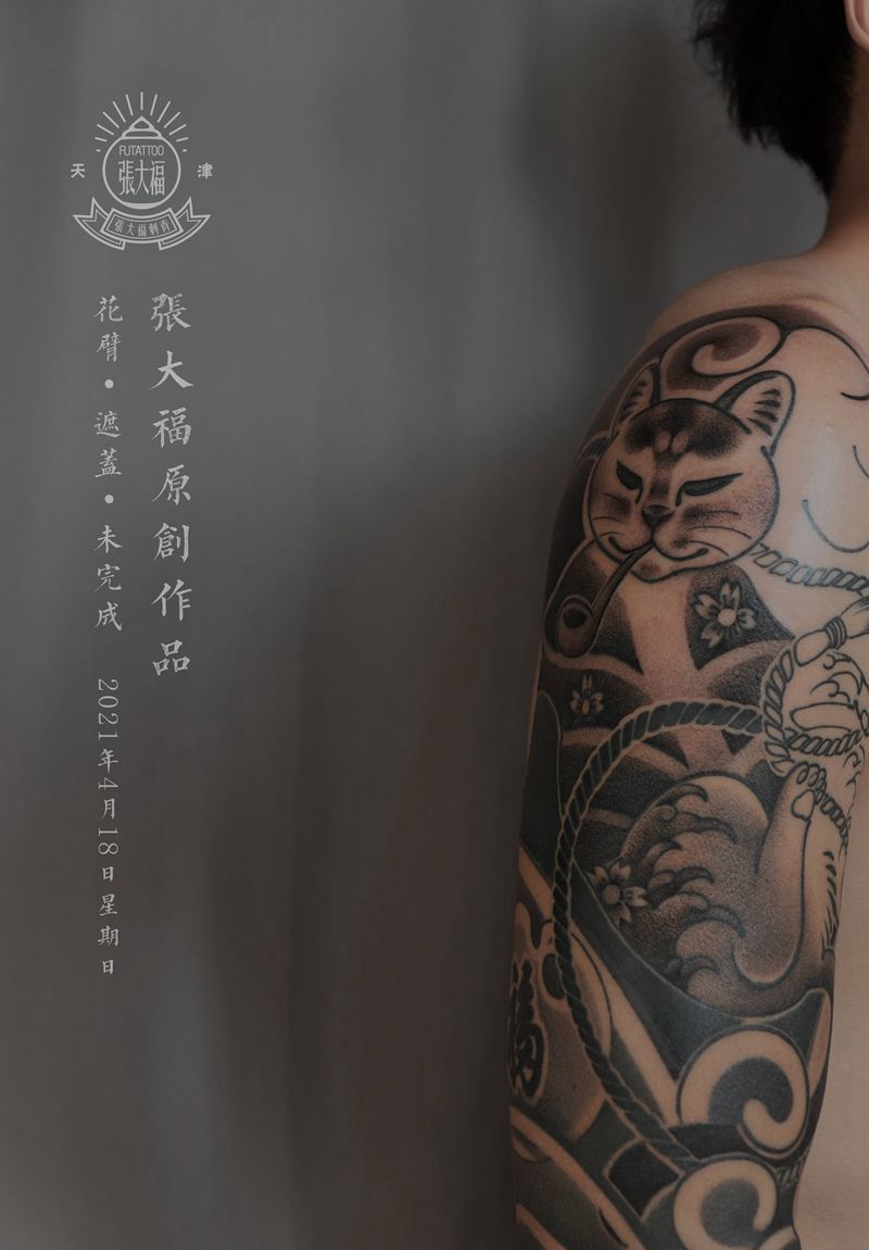 原创 花臂 遮盖纹身图片_手臂老传统纹身猫原创遮盖纹身图案
