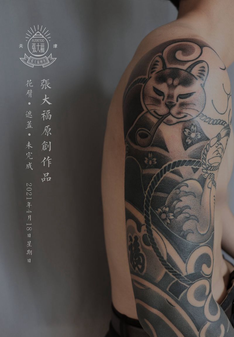 原创 花臂 遮盖纹身图片_手臂老传统纹身猫原创遮盖纹身图案