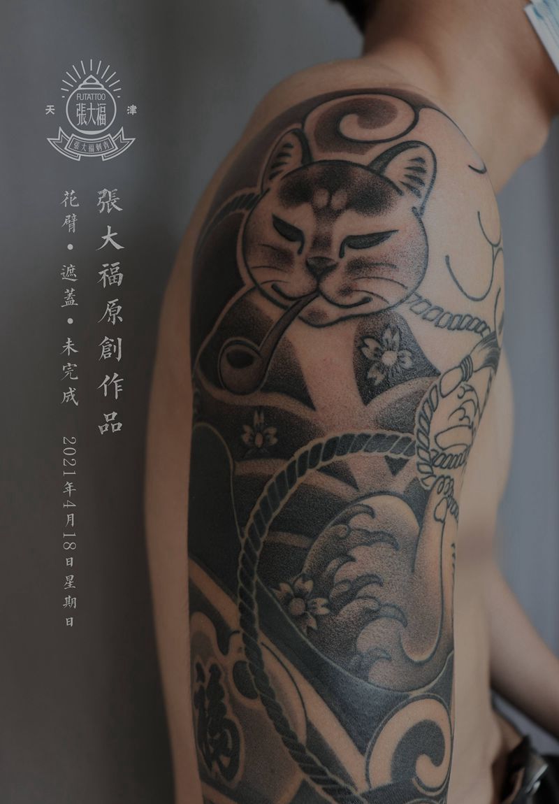原创 花臂 遮盖纹身图片_手臂老传统纹身猫原创遮盖纹身图案