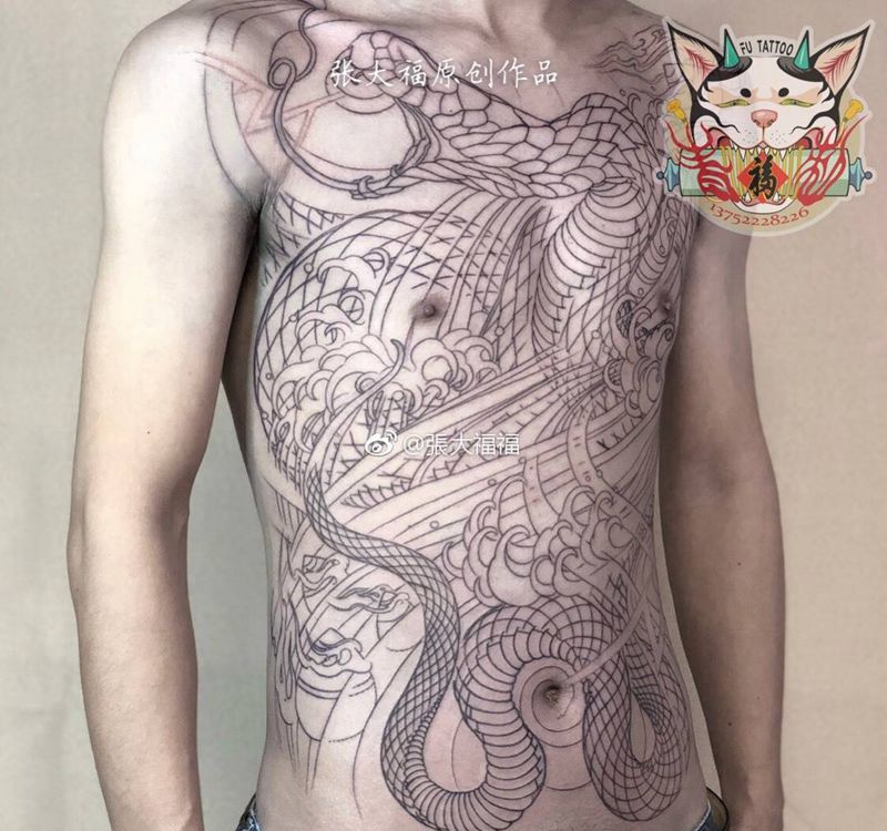 当前位置: 首页 >天津市纹身店-福刺青纹身图案>传统蛇(割线)纹身图片_胸部腹部老传统蛇水浪纹身图案