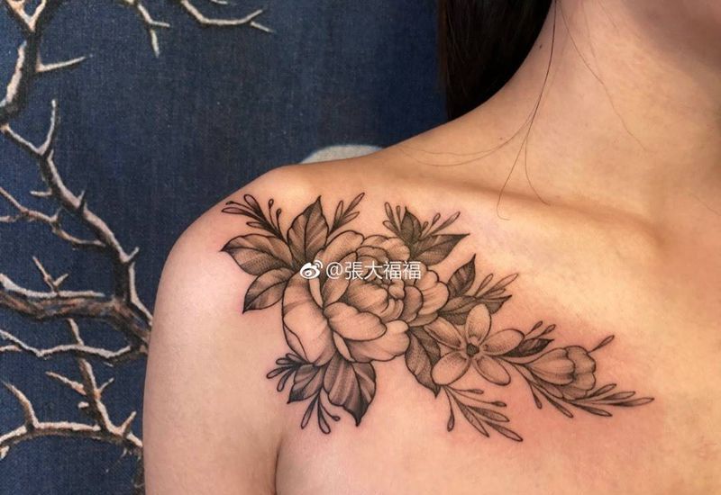 花纹身图片_成品颈部胸部欧美清新植物女生点刺锁骨纹身图案
