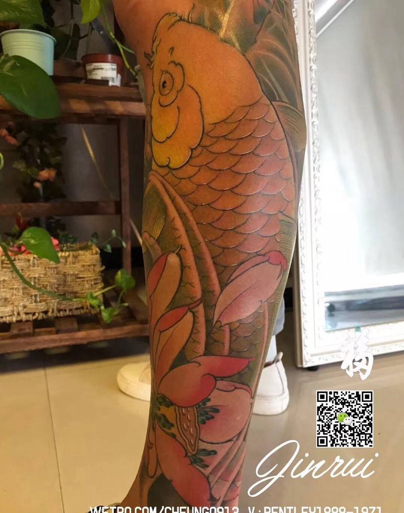 原创小腿侧面荷花鲤鱼纹身图片_成品腿部传统国画动物植物原创纹身图案