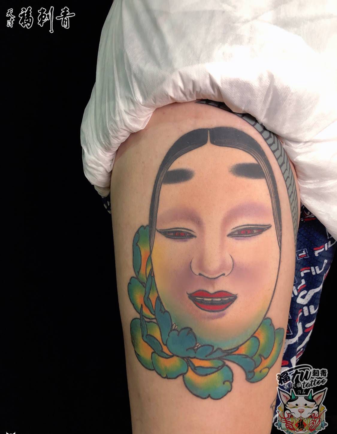 原创能面纹身图片_腿部老传统能面小面日式纹身图案