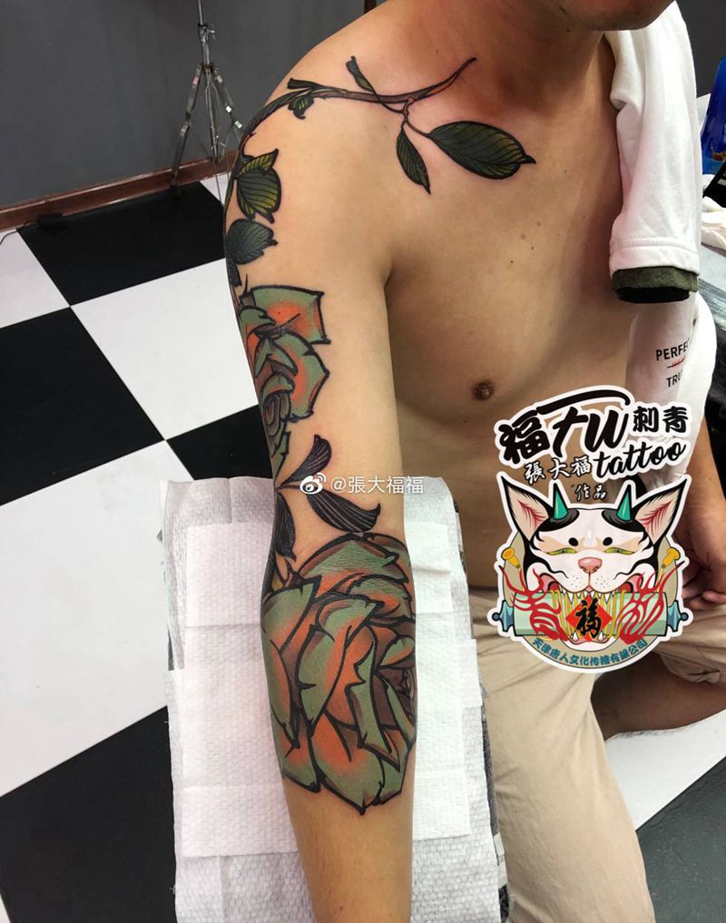 当前位置: 首页 >天津市纹身店-福刺青纹身图案>原创玫瑰盖疤纹身图片_手臂肩部New School原创遮盖玫瑰纹身图案