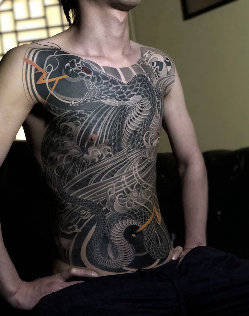 原创满胸满腹蟒蛇纹身图片_腹部胸部老传统蛇蟒黑灰纹身图案