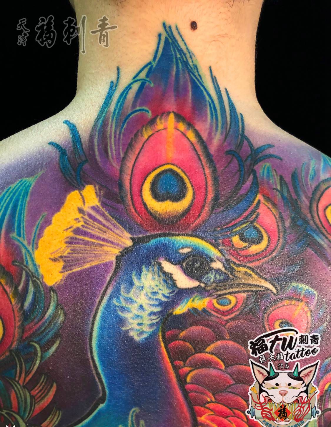 原创半背孔雀(恢复后4个月)纹身图片_颈部背部新传统New School孔雀彩色原创纹身图案