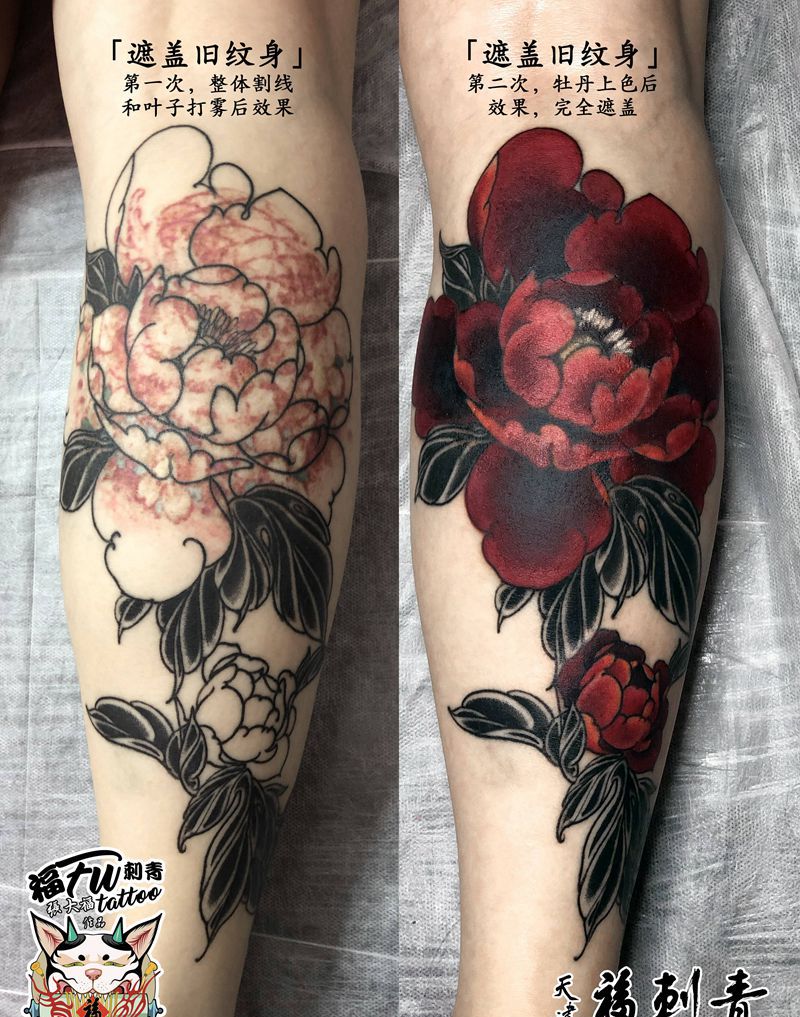 原创牡丹·遮盖2个纹身纹身图片_腿部新传统牡丹遮盖原创纹身图案