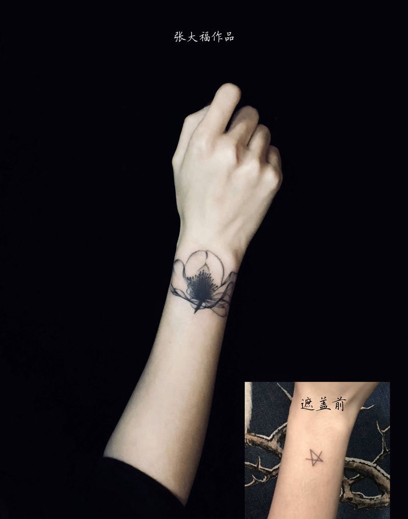 遮盖纹身图片_手臂手部水彩水墨花遮盖黑灰纹身图案