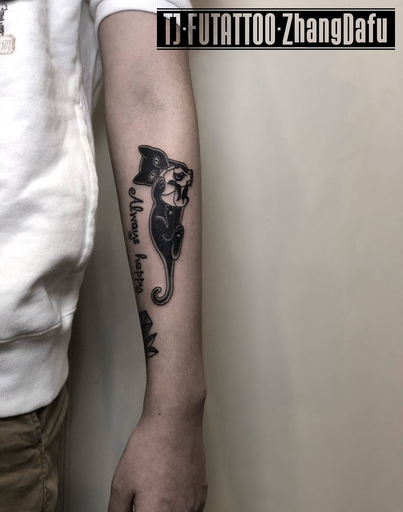 当前位置: 首页 >天津市纹身店-福刺青纹身图案>猫与骷髅纹身图片_手臂Old School猫骷髅拼花臂纹身图案
