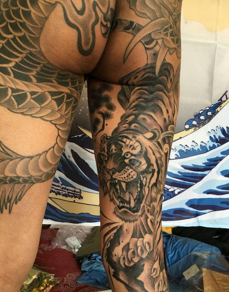 • T网红王老大花腿龙纹身图片_腿部新传统纹身图案